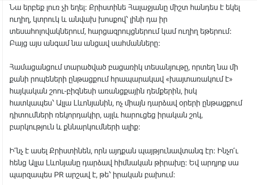 В видео Кристина делает ряд откровений. Он говорит об интригах, покровительстве и «избранной системе», сложившейся в сфере СМИ. Но самую заметную и в то же время самую резкую критику он адресует Алле Левонян.