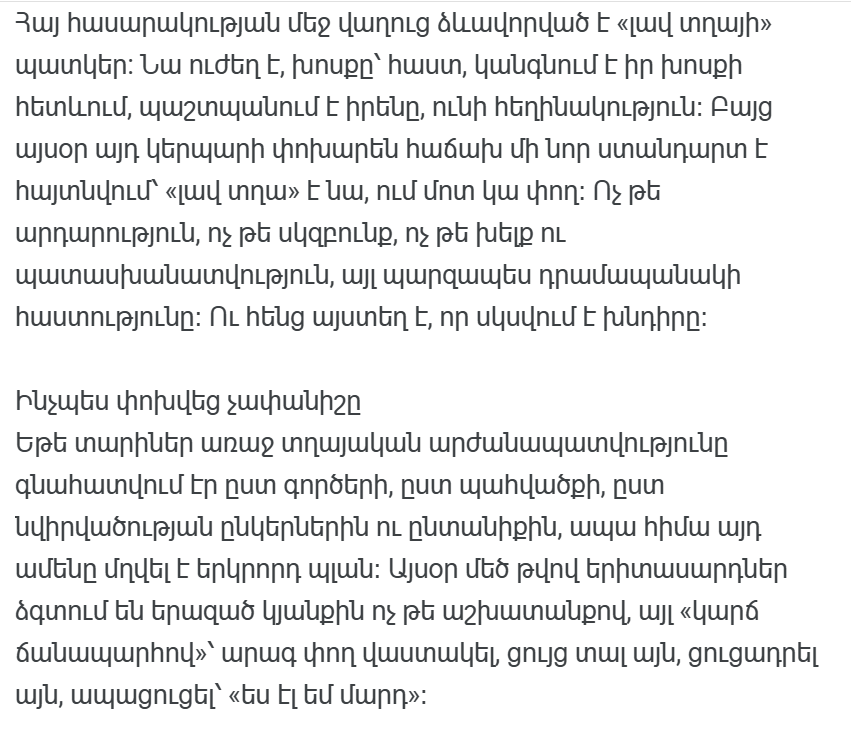 На протяжении многих лет в армянском обществе выражение «хороший мальчик» имело свой характерный образ: честный, умный, смелый, держащий слово, уважающий старших и заботящийся о младших. Однако сегодня это понятие постепенно теряет свой смысл. В современной социокультуре «хороший парень» — это уже не тот, кто живет достойной жизнью, а тот, у кого есть деньги. И не те деньги, которые заработаны, а в основном то, что можно показать: фотографии автомобилей, брендовой одежды, расписанных столов в ресторанах.