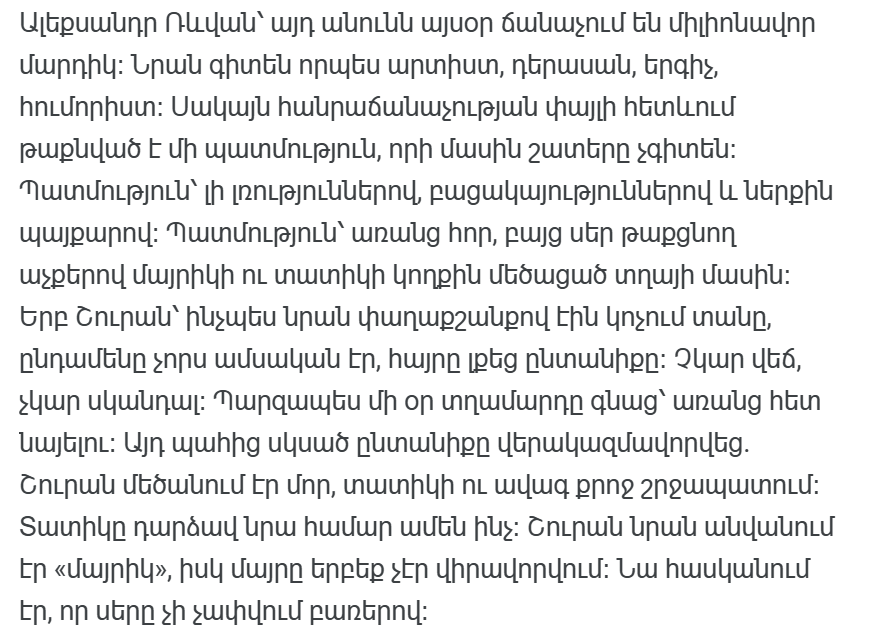 Со временем Шура стал Александром Реввой. Его острый юмор, сообразительность, пластичность и уникальный стиль делали его единственным в своем роде. Он играл персонажей, в которых сочетались любовь, критика и детская простота. И каждый раз, выходя на сцену, он извлекал наружу сложности своего детства, превращая их в творческую силу.