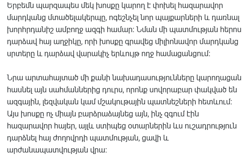 Слова армянской девушки достигли самых отдаленных уголков, доказав, что истина не имеет ни языка, ни культурных барьеров. Он находит прямой путь к сердцу каждого человека, когда-либо любившего свою страну, когда-либо боровшегося за свою идентичность.
