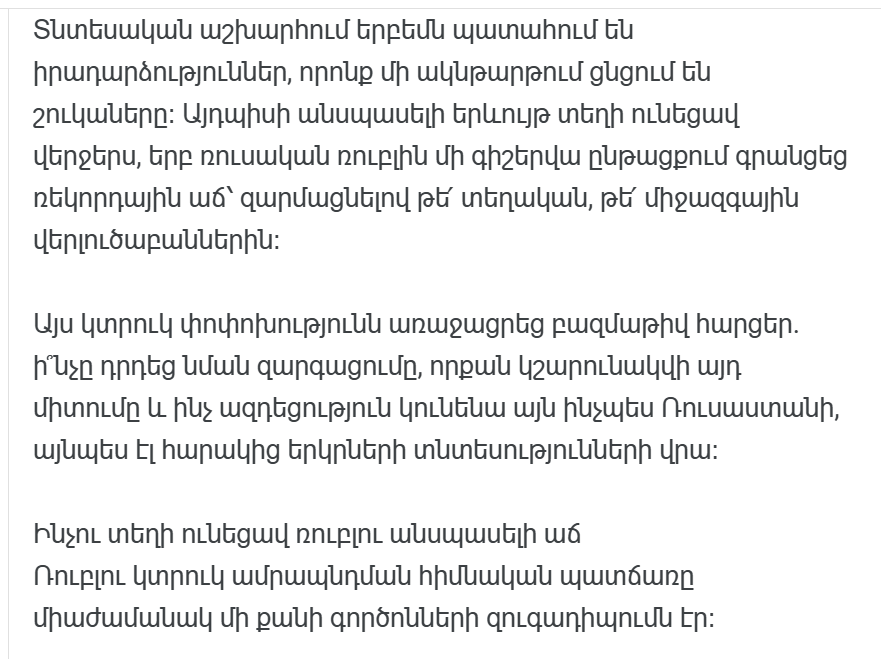 Резкие изменения курса российского рубля немедленно сказываются на экономике Армении, учитывая тесные экономические связи между нашими странами.