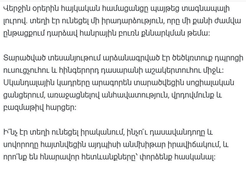 Скандал, произошедший несколько дней назад в сфере образования Армении, продолжает оставаться в центре общественных дискуссий. На видео, которое стало вирусным, показано, как обычная обстановка в классе превращается в шумную и неприемлемую драку.