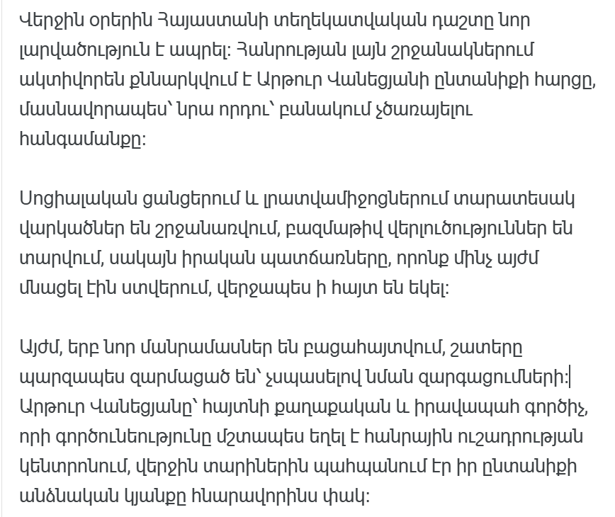 В последние дни в армянском информационном поле возникла новая напряженность. В центре обсуждений — тот факт, что сын Артура Ванецяна не служил в армии. В социальных сетях, средствах массовой информации и на общественных платформах поднимаются вопросы, распространяются предположения и ощущается общественное возмущение.