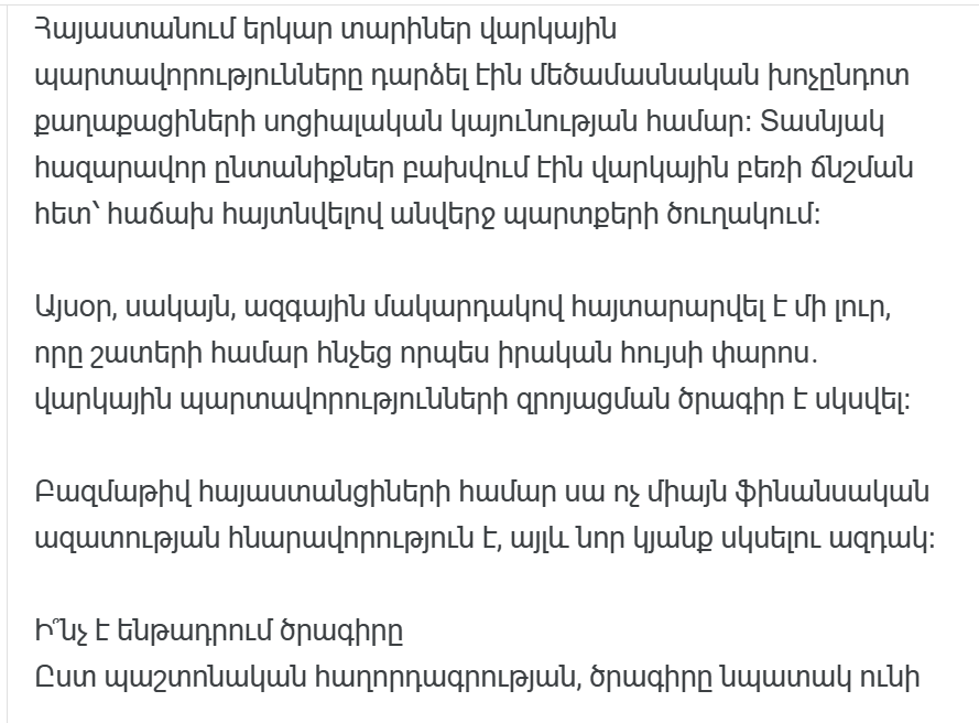 Сегодня перед армянским обществом открываются новые возможности. Программа прощения кредитов — это не только финансовое освобождение, но и начало нового будущего.