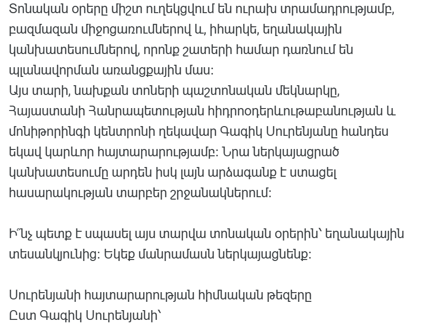 Праздники всегда отличаются приподнятым настроением, яркими событиями и семейным теплом. Однако в этом году праздники добавляют еще один фактор праздничного настроения: прогноз погоды. Начальник Центра гидрометеорологии и мониторинга Республики Армения Гагик Суренян представил свой прогноз погоды, ожидаемой в праздничные дни, который вызвал большой интерес в различных кругах общества.