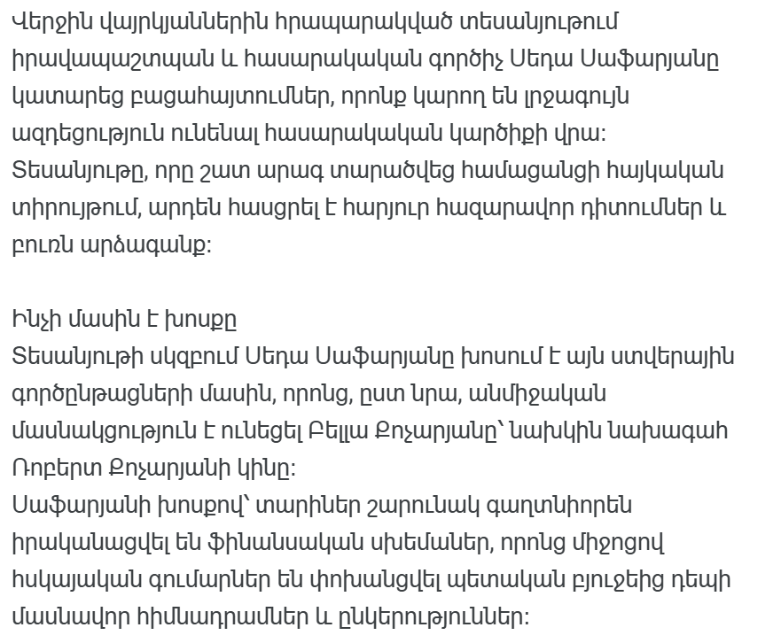 По словам Сафаряна, на протяжении многих лет тайно реализовывались финансовые схемы, посредством которых огромные суммы денег из государственного бюджета переводились в частные фонды и компании.