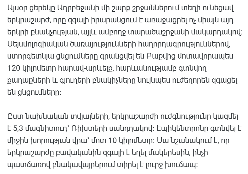 По официальным данным, землетрясение было зафиксировано в 09:47 по местному времени. Эпицентр находился примерно в 130 километрах от Баку, недалеко от Ширванского района. Магнитуда подземных толчков составила 5,6 балла по шкале Рихтера, а гипоцентр находился на глубине около 10 километров, что объясняет высокую интенсивность, зафиксированную на поверхности.