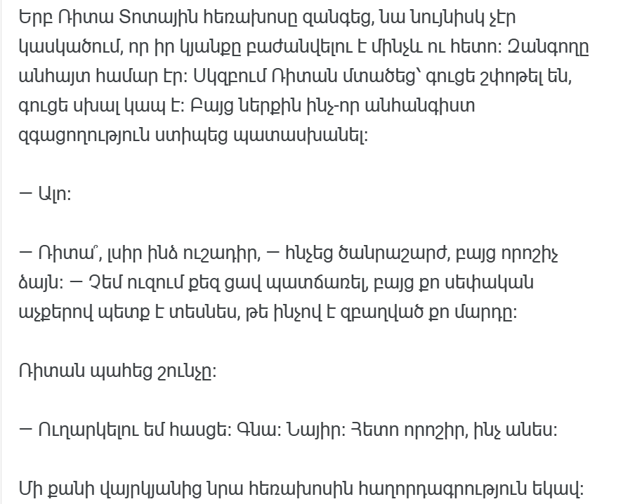 Когда Арсен вернулся домой, Рита ждала его с той же улыбкой, которую он привык видеть годами. Арсен рассказал какую-то абсурдную историю о своей долгой деловой встрече. Рита только улыбнулась и кивнула. Он также не видел необходимости в объяснениях.