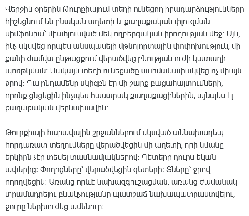 Произошедшее в Турции в последние дни трудно охарактеризовать исключительно как стихийное бедствие. Наводнения, вызванные беспрецедентно сильными дождями, практически полностью парализовали несколько крупных регионов, а последствия произошедшего уже значительны не только на гуманитарном и социальном уровне, но и на политическом. Исключительная ситуация показала, насколько уязвимы государственные институты, когда они не могут или не желают своевременно отреагировать на катастрофу. Эти события могут стать поворотным моментом не только в стране, но и в регионе.