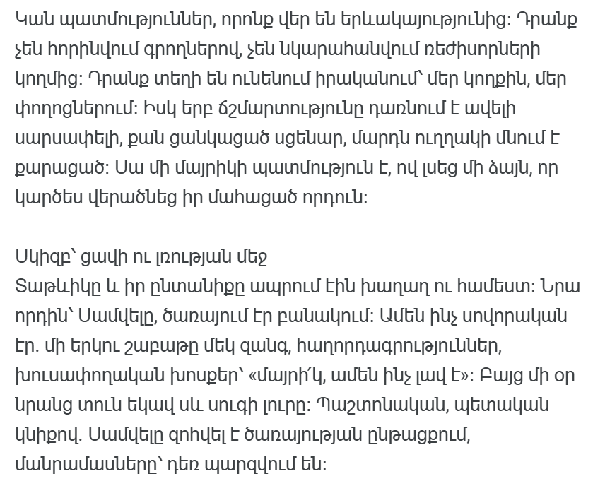 Татевик была матерью Нарека, старшего из троих детей. Нарек служил в пограничной воинской части. Однажды, без всякого предупреждения, в дом пришло официальное извещение о смерти. Армия сообщила, что Нарек погиб в результате внезапного взрыва. Тело, как уже упоминалось, сильно повреждено и не подлежит вскрытию.
