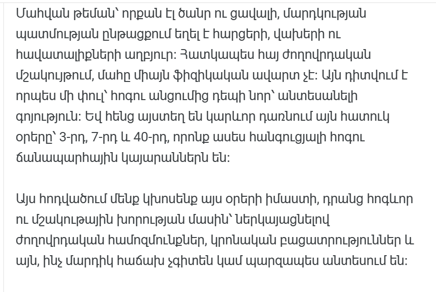 Самый глубокий день в армянских верованиях — 40-е число. Считается, что в этот день душа сталкивается со своей вечной судьбой. Согласно поверью, в этот день определяется, куда отправится душа — в свет или во тьму. Это не просто религиозное определение, а культурная философия.