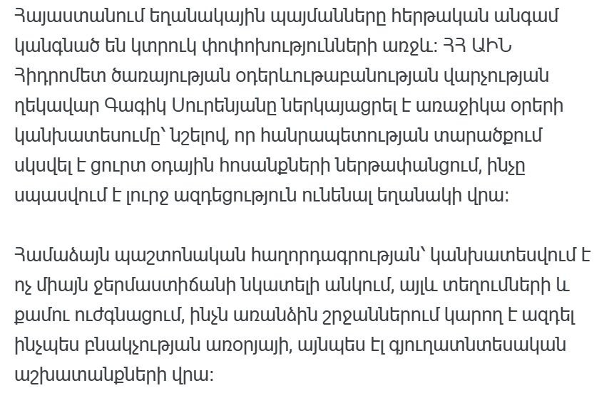 Проникновение таких течений в Армению сопровождается резкими изменениями. Понижение температуры обычно фиксируется в течение нескольких часов, преимущественно ночью. По словам Суреняна, это только начало.