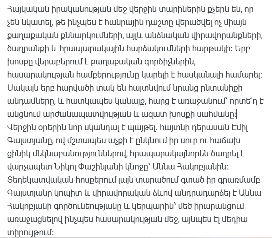 Эта история особенно необычна тем, что она не ограничивается сферой политических дебатов, а выходит за рамки личных оскорблений и вопросов общественной морали. Это стало не только новостью, но и важным исследованием армянского общественного сознания.