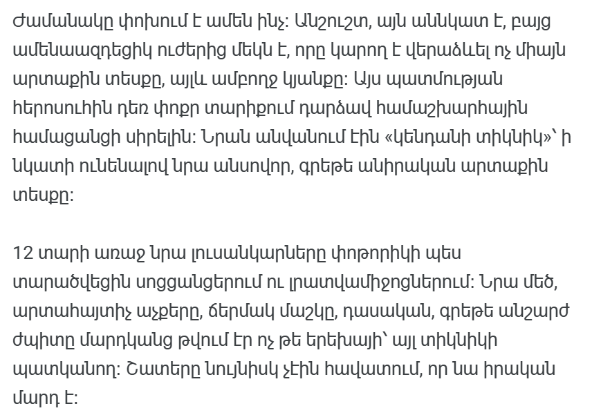 Когда девочка стала подростком, изменилась не только ее внешность, но и мировоззрение. Черты его лица начали меняться, и детская нежность постепенно уступила место зрелости. Но проблема была в том, что общественность не приняла эти изменения.