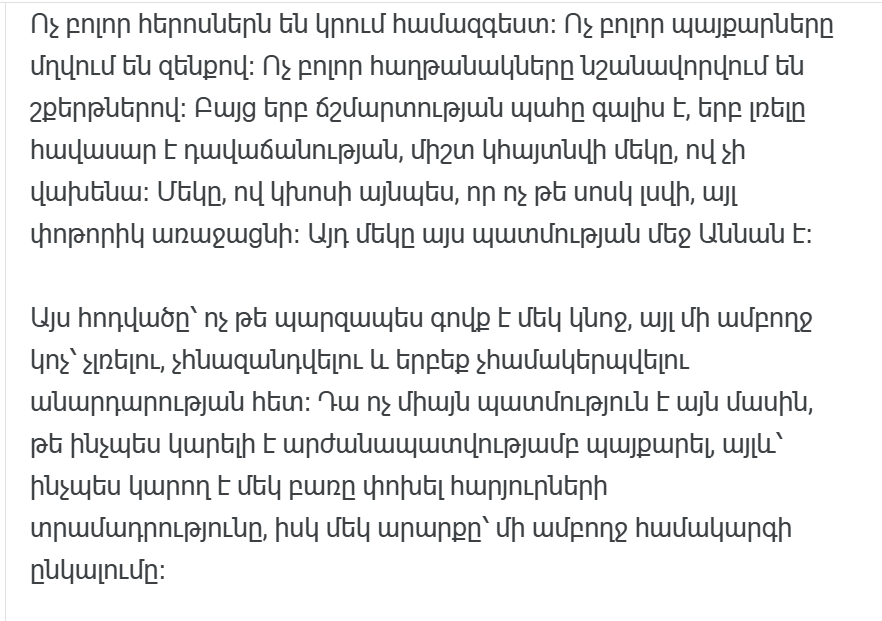 Анна не исключение. Он представляет собой возможность. Он доказывает, что сила, которую мы ожидаем, на самом деле находится внутри нас. И когда один человек решает не бояться, с этого момента «он» начинает бояться.