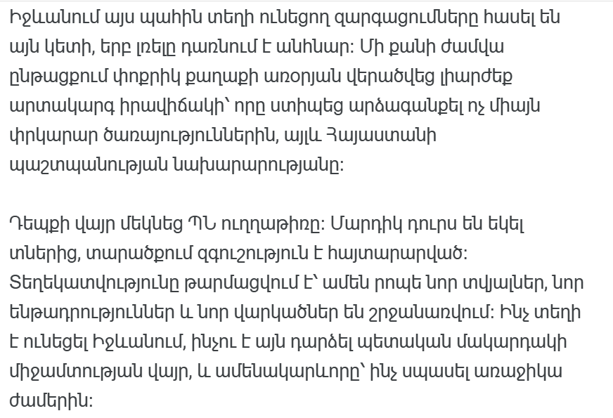 Сегодня в Иджеване происходит событие, выходящее за рамки обычных новостей. Это происходит практически без предупреждения, но находит отклик на всех уровнях: местном, региональном и национальном. Когда вертолет Министерства обороны приземляется в городской местности, на месте чрезвычайной ситуации, это уже не локальный инцидент. Это серьезная ситуация национального масштаба.