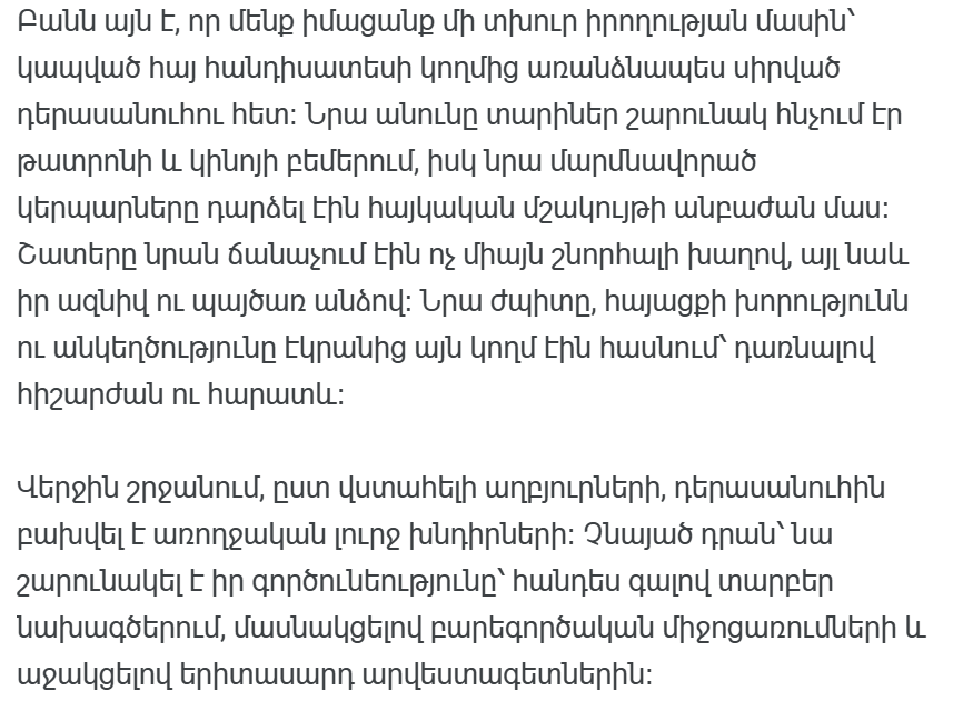 В культурном поле Армении, где артисты и деятели искусства давно вышли за рамки рядовых публичных персон, любая новость о них становится эмоциональным ударом для всего общества. Когда речь идет о человеке, который уже много лет выступает на сцене, снимается в кино и на телевидении, чьи образы и присутствие, без преувеличения, повлияли на душевный мир тысяч людей, такие новости просто невозможно воспринимать равнодушно.