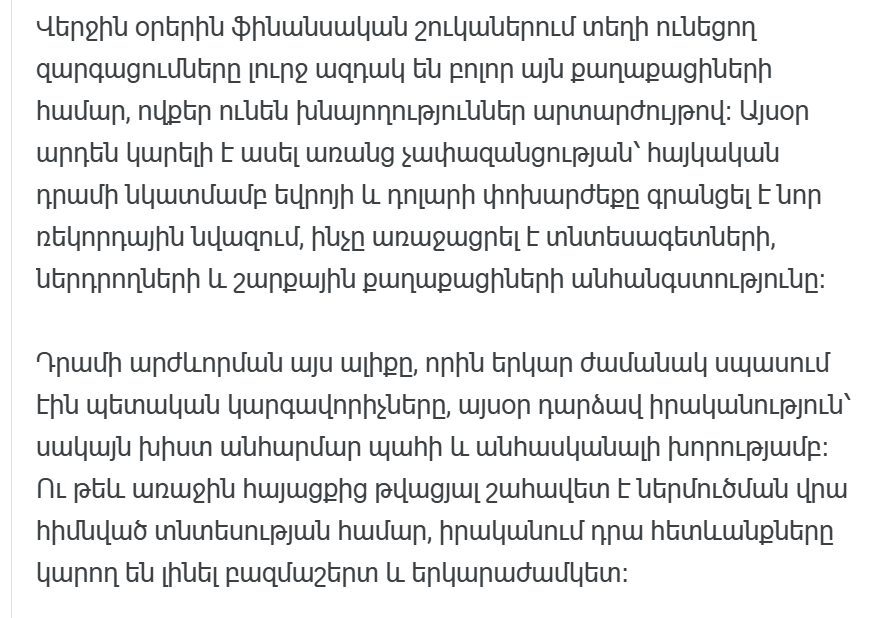 Многие люди, годами копившие сбережения в долларах или евро, теперь сталкиваются с серьезной реальностью: их деньги буквально обесцениваются. В некоторых случаях потери составляли тысячи драмов за один день. Это не шутка. Такова истинная картина валютного рынка, который в настоящее время переписывает рамки финансового мышления.
