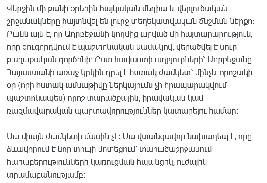Крайний срок, установленный сегодня Азербайджаном, — это не просто документ, адресованный правительству Армении. Это адресовано всему армянскому народу. Это провокационное послание может иметь долгосрочные последствия, если на него не будет дан по-настоящему достойный и обоснованный ответ.