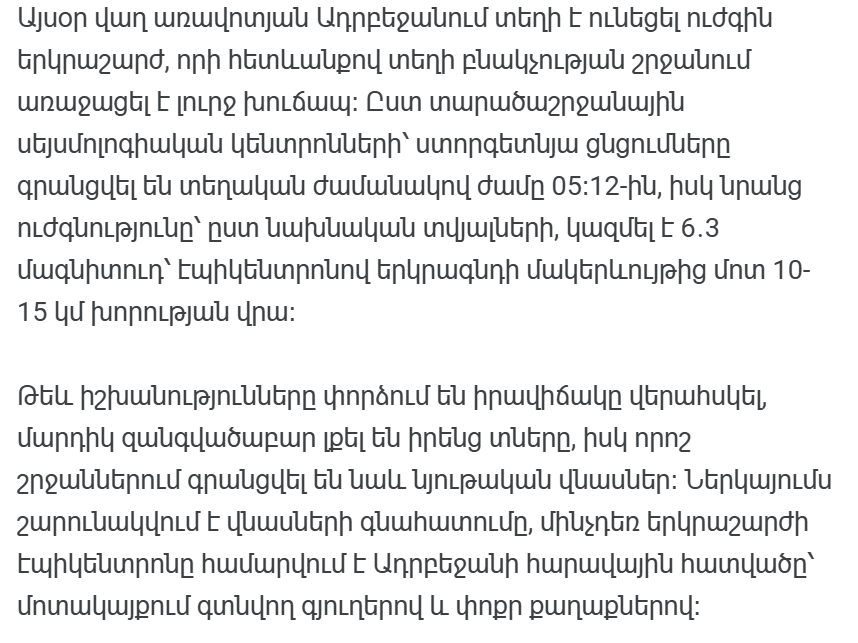 Среди большого потока информации уже появились волны дезинформации, в частности, непроверенные сообщения о вторичных землетрясениях или о том, что в Баку якобы обрушились многоэтажные дома. Власти призывают не верить неофициальным источникам и следовать только подтвержденной информации.