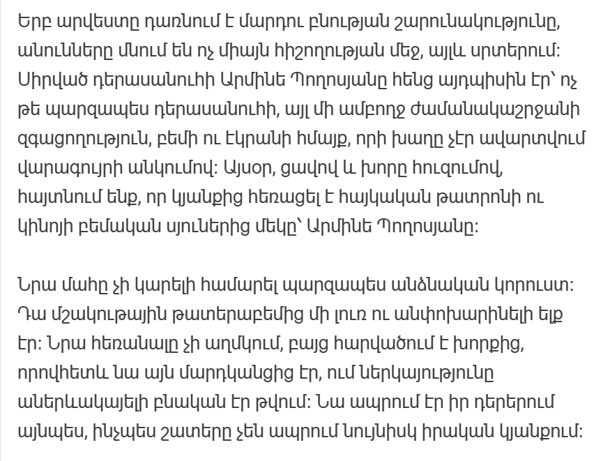 Смерть Армине Погосян — культурная утрата. Но наследие, которое он оставил после себя, — это жизнь. Жизнь, переданная зрителям, ученикам, коллегам и всем тем, кто видел его пьесу хотя бы раз. В его присутствии невозможно было оставаться равнодушным. Он обладал той тонкой, но ясной силой, с помощью которой он заставлял вас слушать, чувствовать и думать.
