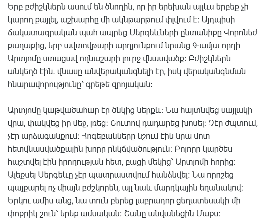 Когда жизнь меняется в одно мгновение, когда врачи ясно говорят: «Ваш ребенок никогда больше не будет ходить», что-то внутри родителя надламывается. Алексей Сергеев пережил такой момент вместе со своей семьей, когда его девятилетний сын Артем получил серьезную травму позвоночника в результате автомобильной аварии. После сильной боли и неврологического шока мальчик остался парализованным. Врачи заявили, что шансы на выздоровление крайне малы.