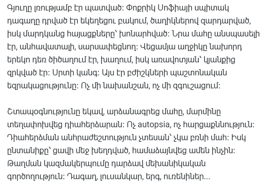 Атмосфера в деревне была тяжёлой. Воздух был наполнен тишиной, а церковный двор был заполнен группой скорбящих. Все пришли проститься с шестилетней Софией — здоровым, живым, любимым ребенком, жизнь которого, по словам врачей, оборвалась в одночасье из-за остановки сердца.
