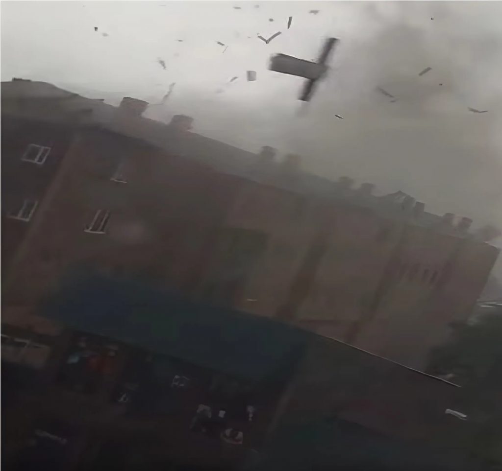 Первое видео снял ученик местной школы. На кадрах видно, как вдалеке начинает вращаться гигантский столб пыли и мусора. Секунды спустя — крики, паника, дома начинают разрываться на части, крыши взлетают в воздух, срываются заборы, автомобили переворачиваются. Люди в панике бросаются в укрытия. Некоторые, не веря своим глазам, продолжают снимать происходящее.