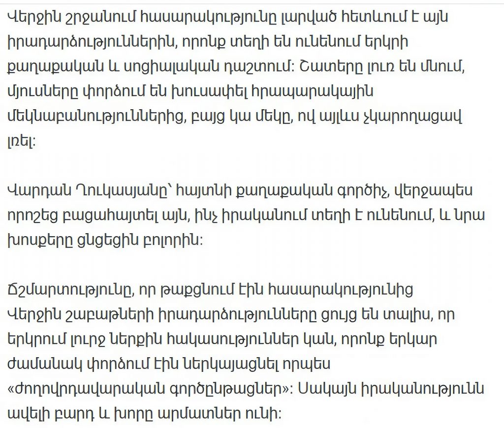 «Пришло время людям узнать, что происходит на самом деле». На протяжении многих лет мы наблюдаем, как некоторые деятели эксплуатируют национальные ценности, как они продвигают свои личные интересы за счет народа. «Они хотят заставить нас замолчать, но я больше не буду молчать», — заявил Гукасян.