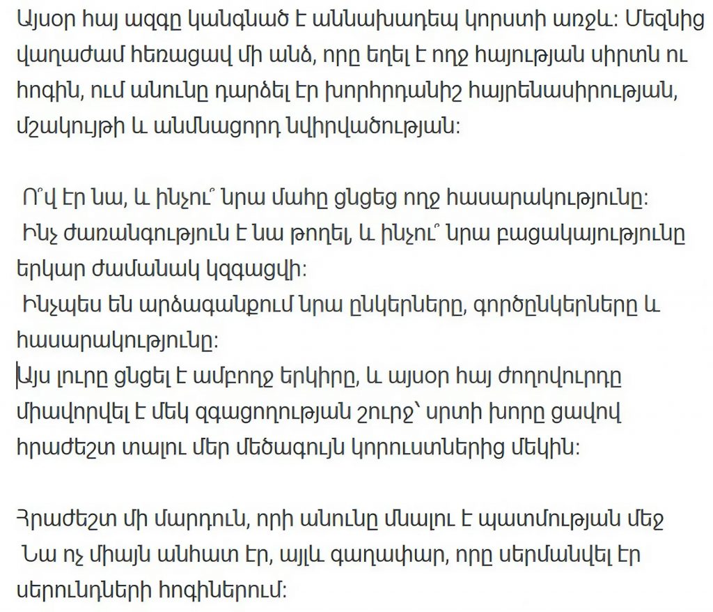 Эта новость потрясла всю страну, и сегодня армянский народ объединился вокруг одного чувства: с глубокой сердечной болью проститься с одной из наших самых больших потерь.
