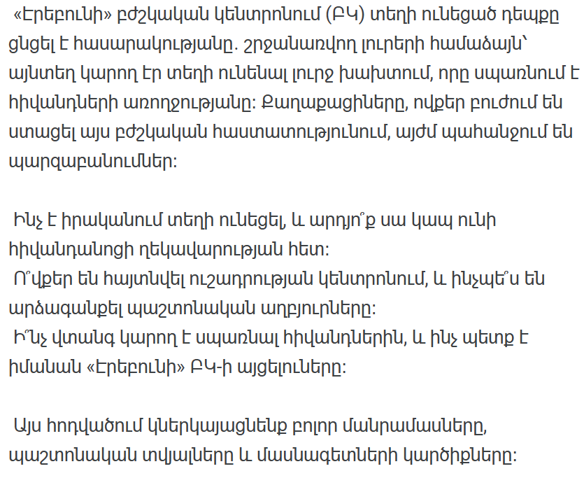 В Интернете и различных СМИ распространилась информация о том, что в медицинском центре «Эребуни» могли иметь место нарушения, представляющие опасность для здоровья пациентов.